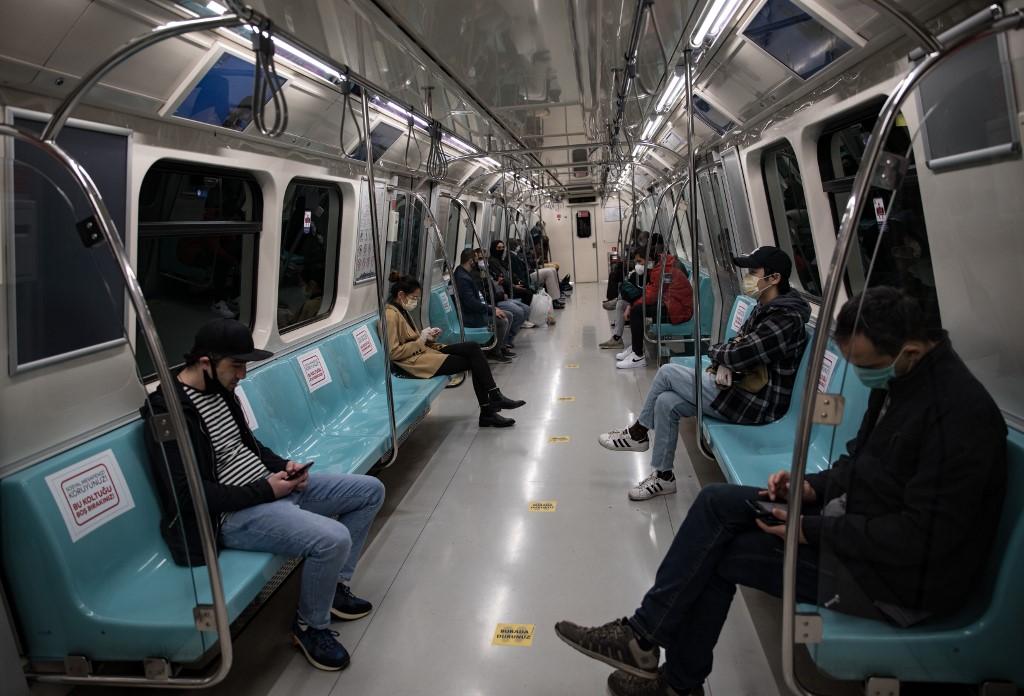 People wearing a face mask sit on the metro while respecting social distancing in Istanbul, Turkey, on 7 May 2020. By Cem Tekkeşinoğlu / AFP.